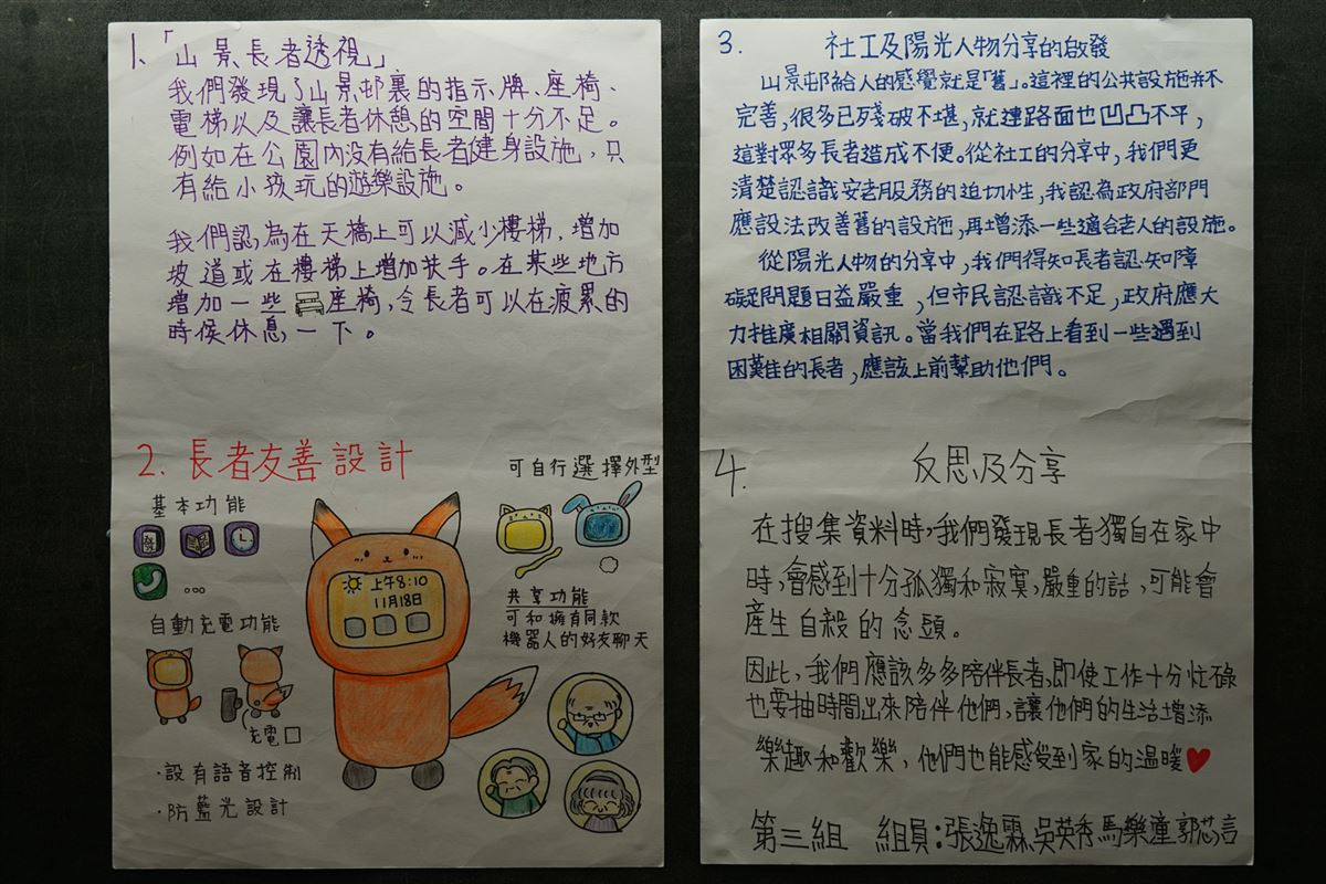 Students acquired knowledge on Hong Kong's ageing population and how the expanding silver-age market would imapct their career planning. Care of the elderly is fostered through examining the elderly's quality of life and the government's role and policies in elderly care.