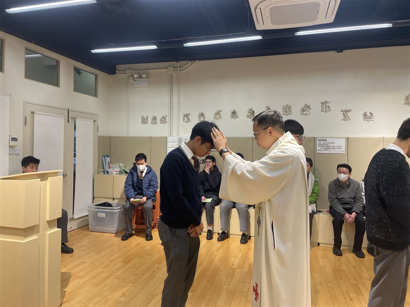 Quoting the day's Responsorial Psalm, "In God I trust; I shall not fear," Fr. Leung encouraged students to rely on the Lord and pray for the strength to face upcoming challenges; he also expressed gratitude to the students and their contributions throughout their secondary school life. Before dismissal, Fr. Leung gave each student a blessing and a sacred object as gift. Many teachers and students attended the Mass, joining in prayer for the S6 students in union.